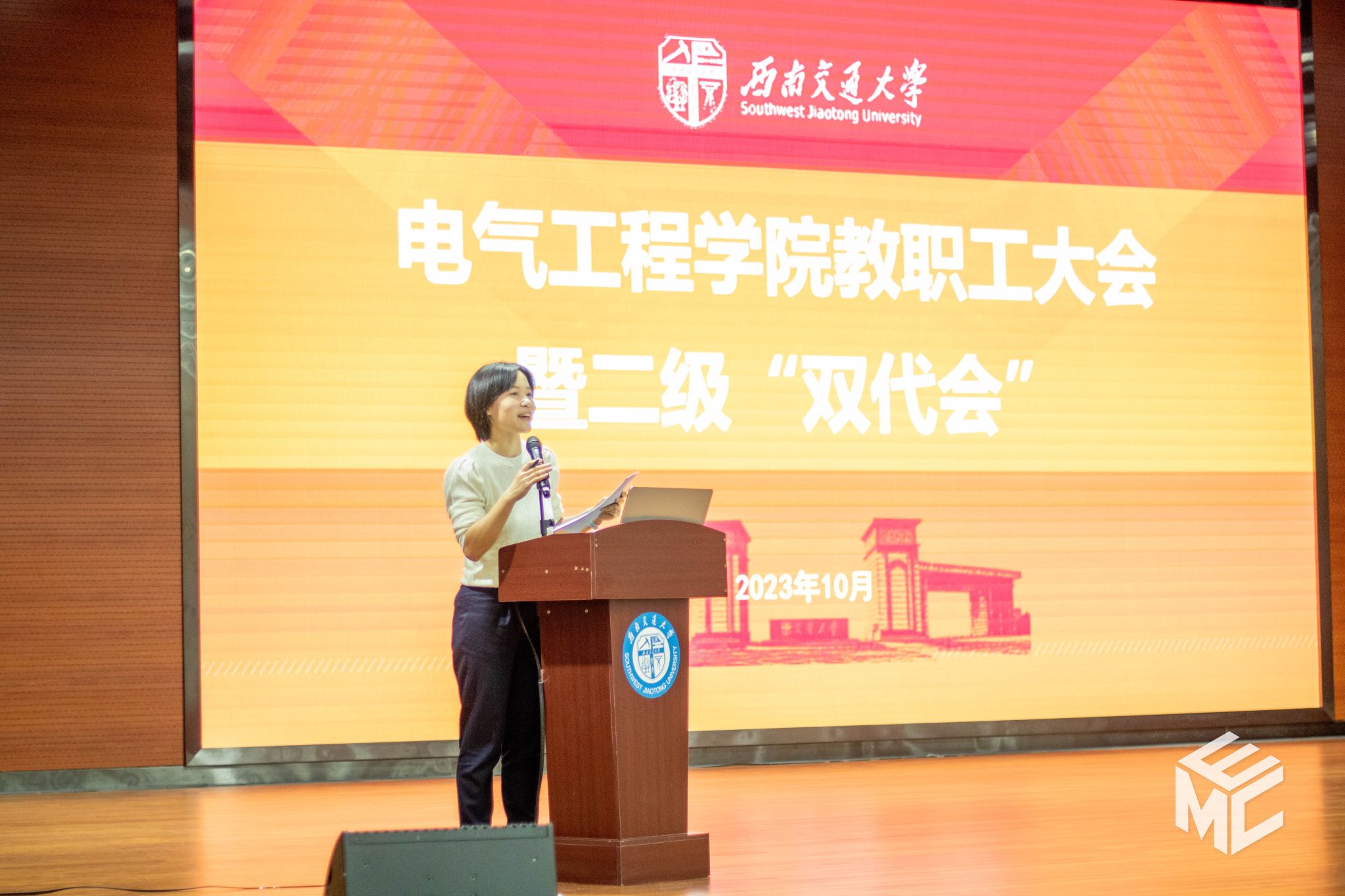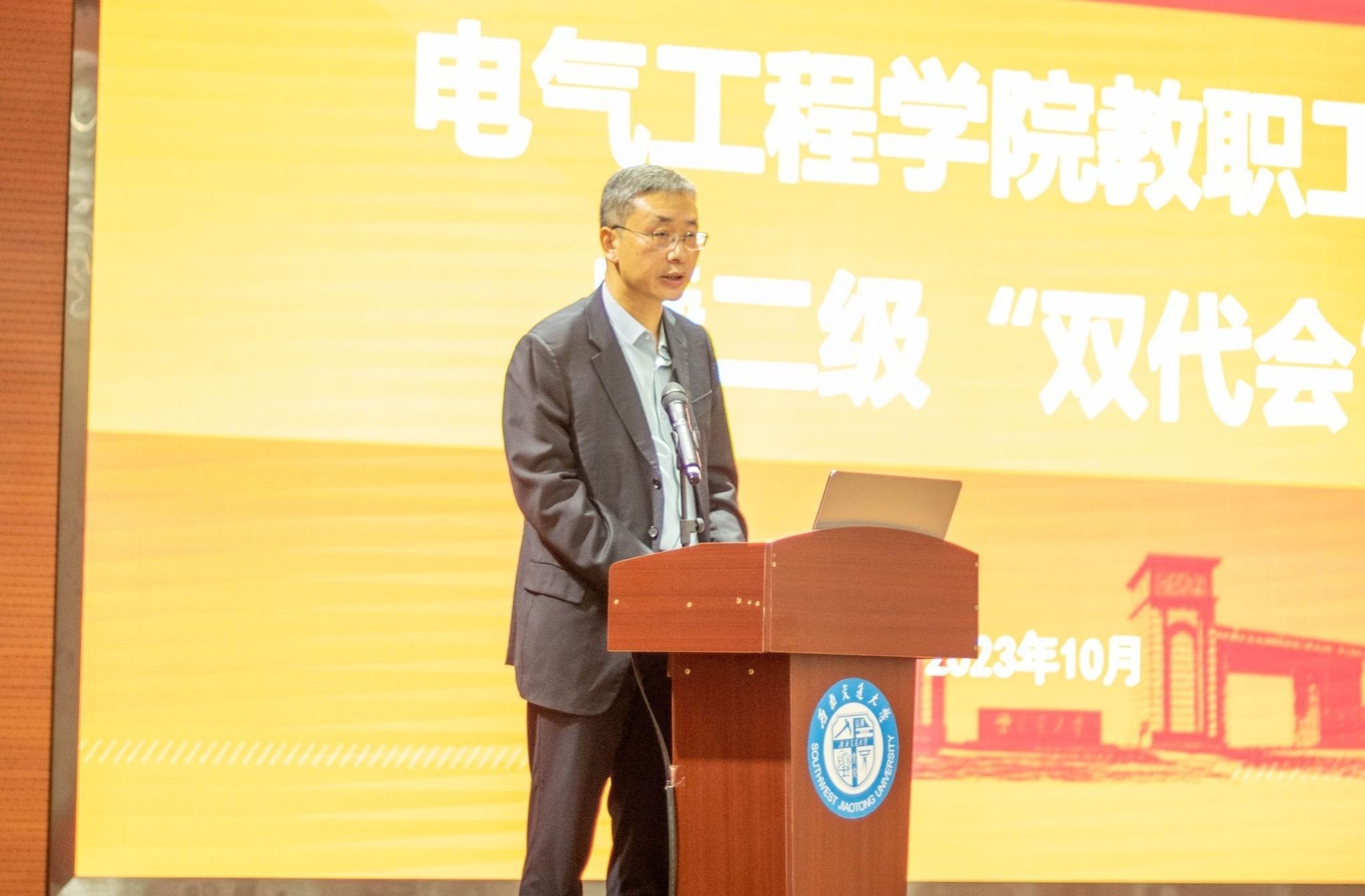 2023年10月10日下午,awc777万象城娱乐官网2023年“双代会”在犀浦校区一食堂三楼顺利召开。院长何正友,党委书记王斌,党委副书记谢力,党委副书记、工会主席王轶,副院长何晓琼、解绍锋、陈民武、胡海涛、刘志刚参加会议。因院情院务公开需要,本次“双代会”扩大至全院教职工范围,学院“双大会”代表与全体教职工参加会议。会议由党委王斌书记主持。