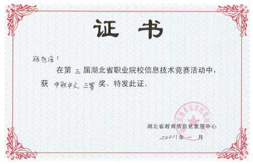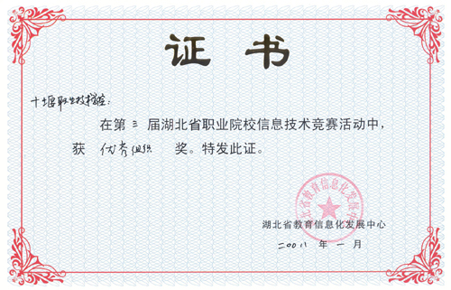 新闻网讯 近日,湖北省教育信息化发展中心表彰了湖北省第三届职业院校信息技术竞赛获奖单位及选手,MILE米乐官网计算机工程系学生张旭海同学获高职中文类三等奖,经济贸易系学生徐金凤同学获高职英文类三等奖,计算机工程系学生邓浇华、黄芳、王芳、经济贸易系学生管海翠、林宽同学获高职中文类优秀奖,十堰职业技术学院获优秀组织奖。