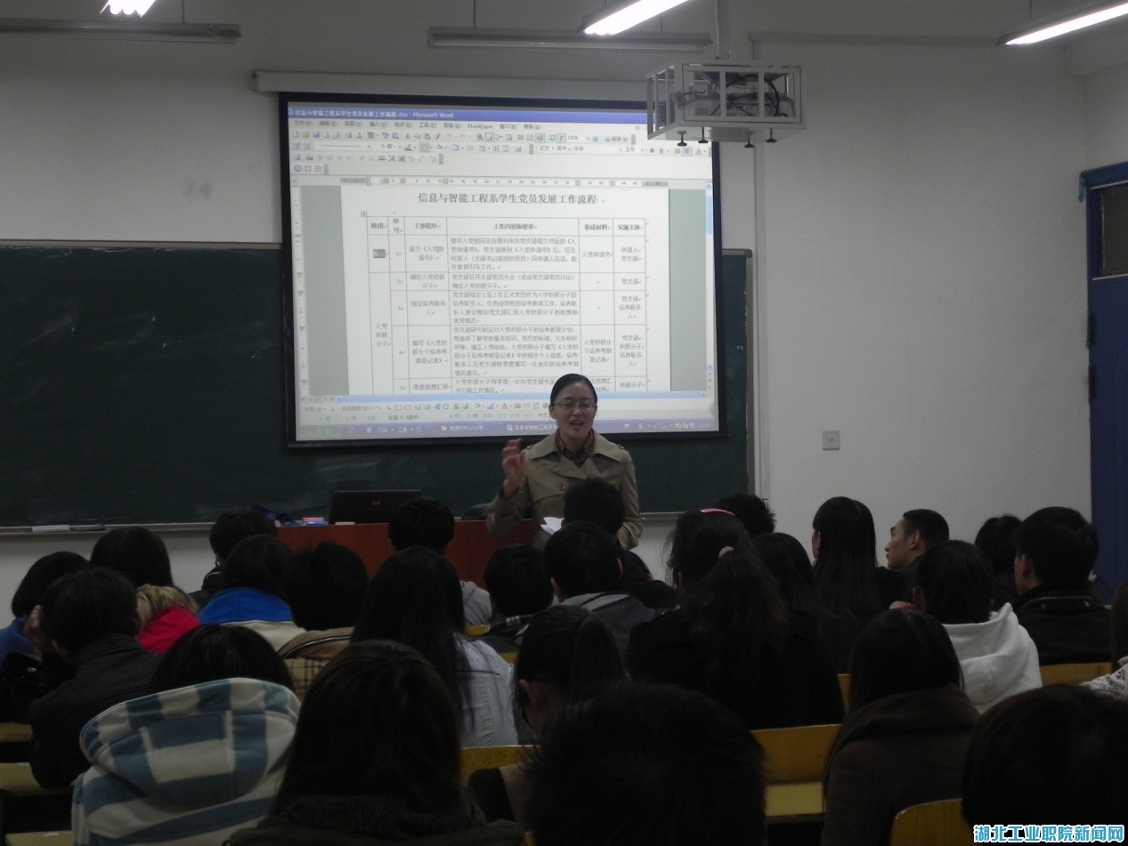 新闻网讯(学生记者 谢竹)11月5日晚,信息与智能工程系组织2013级新生及2012级入党积极分子在4401教室召开学生党员发展工作流程座谈会。辅导员陈黎及肖玉参加了本次活动。座谈会由该系党总支书记莫足琴主持。