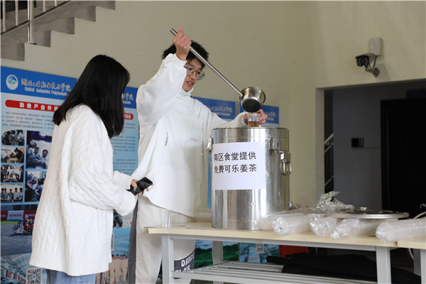 天气阴冷,学校组织了接送车辆和大量志愿者帮助新生搬运行李物品,提供热腾腾的可乐姜茶,入学报到“一站式”服务等多项暖心举措,让新生和家长切实感受到来自学校的温暖。