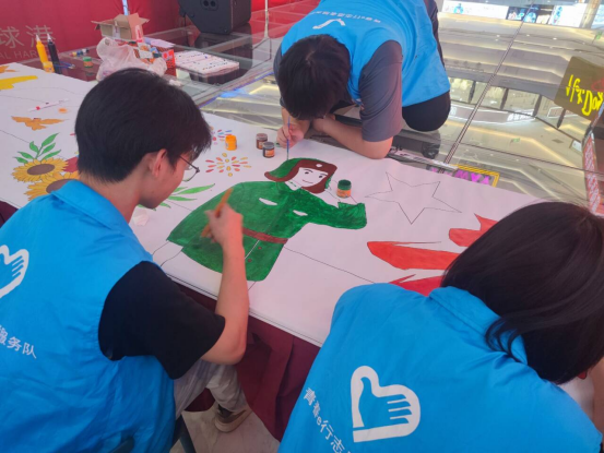 志愿者们协同组装“七一”主题立牌,绘制抗战胜利主题颜料画,并精心陈列承载历史记忆的旧报纸、邮票、照片等珍贵实物,营造出浓厚的历史氛围。