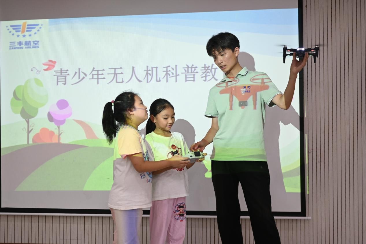 最令人期待的当属无人机飞行演示。当老师操控着无人机缓缓升空,做出悬停、旋转、低空穿梭等动作时,孩子们纷纷发出惊叹。随着老师切换实时传输画面,孩子们通过屏幕看到了从空中俯瞰的场景,直观感受到无人机的应用价值,眼神里满是向往。