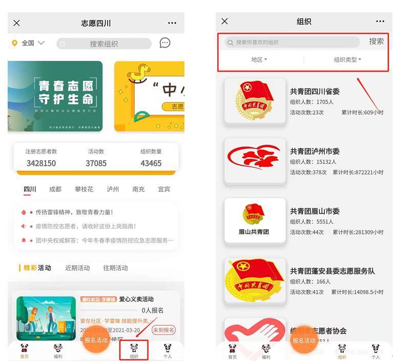 进入“志愿四川”平台首页,点击下方组织,按照标准筛选或自己输入,找到组织。