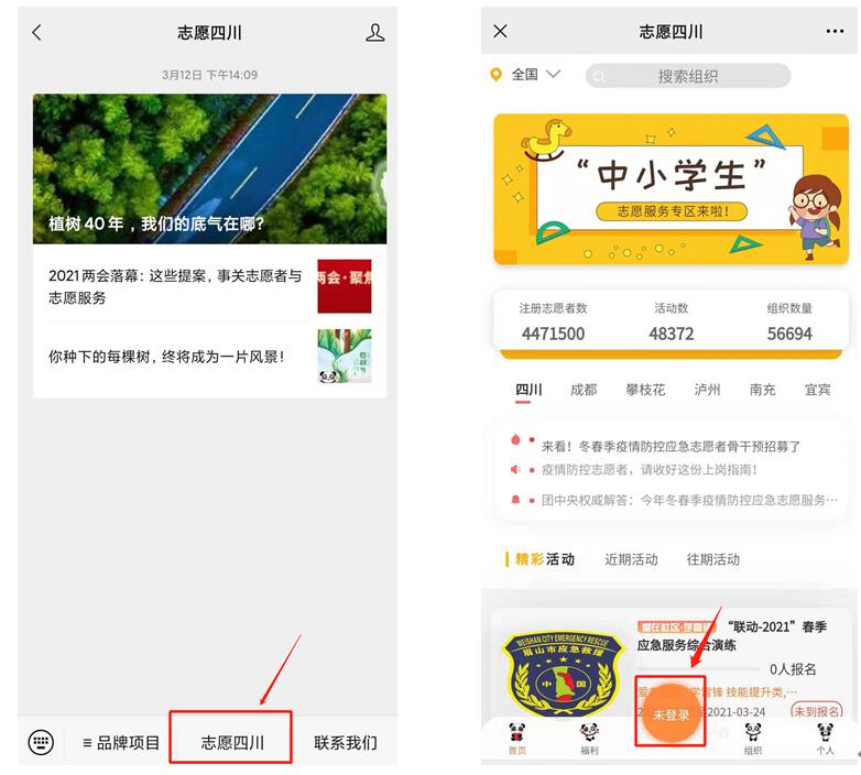 第二步:进入“天府新青年”或“志愿四川”公众号,点击左下方“志愿四川”进入平台首页,点击下方“未登录”按钮。