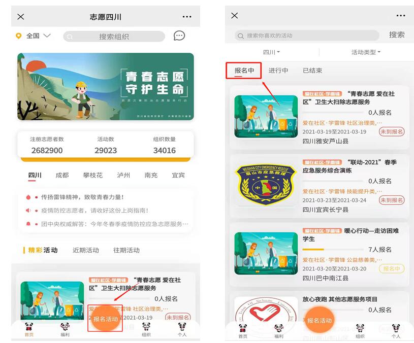 第一步:进入志愿四川平台首页后,点击“报名活动”按钮。