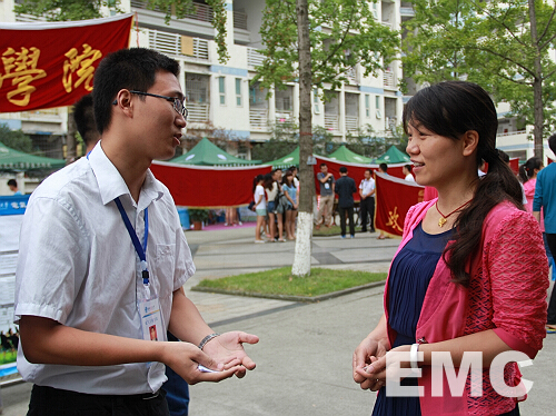 虽然工作的时间很长,但她们的精神一直很饱满,不管是安排迎新工作还是接待新生和他们的家长,她们一直很热情很耐心。就在我跟她们谈天的时候,一位申请缓缴学费的新生来找她们帮忙,高晗雨学姐细心帮他说明了一下手续的流程。