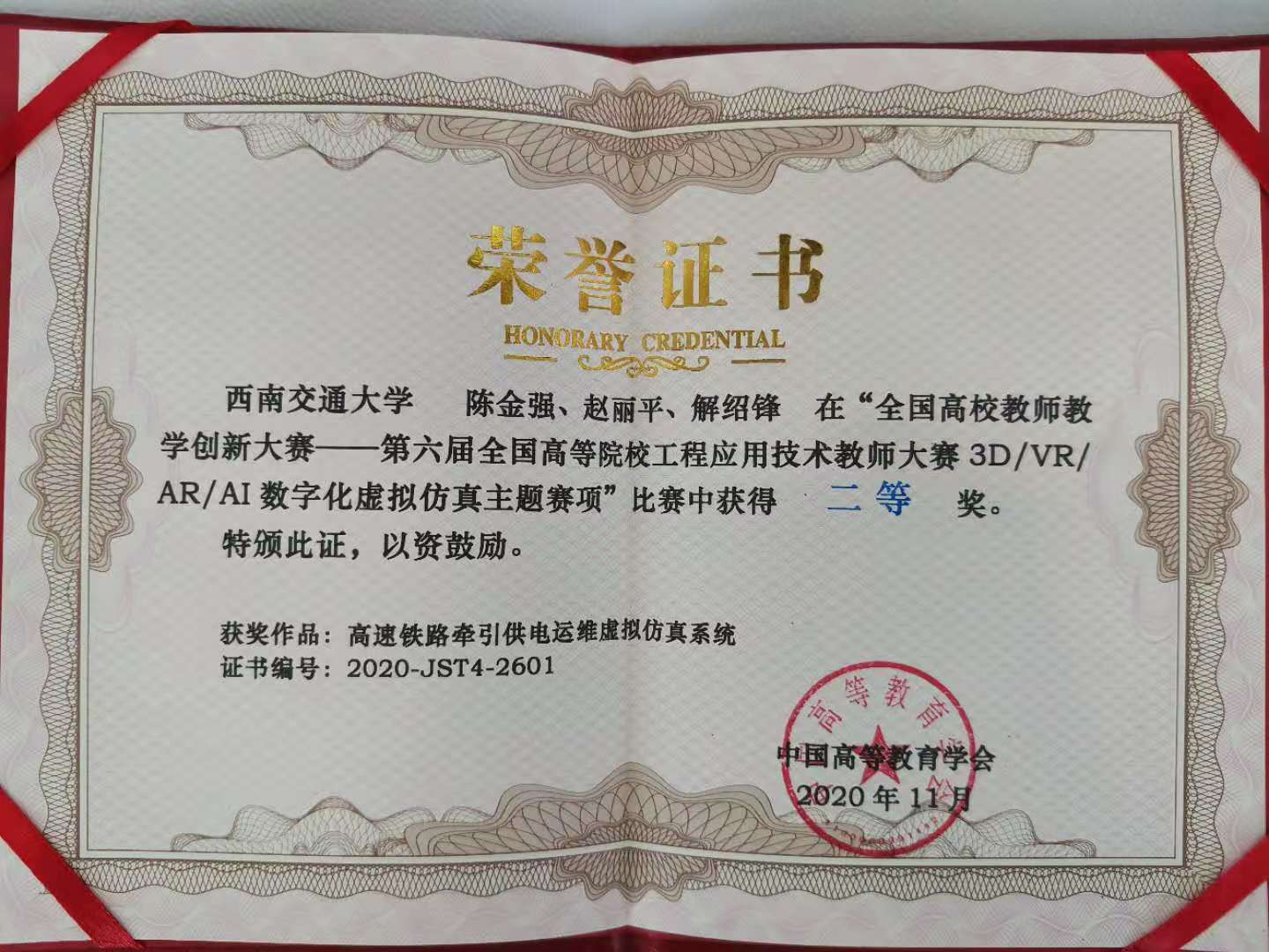 11月10日,全国高校教师教学创新大赛3D/VR/AR数字化虚拟仿真主题赛项颁奖仪式在长沙落下帷幕。经过省级赛区选拔和全国总决赛的评审和答辩环节的激烈角逐,我校awc777万象城娱乐官网高铁供电虚拟仿真实验团队教师陈金强、赵丽平、解绍锋获得全国二等奖。