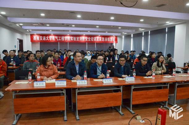 为带动师生关注实验室安全,加强自我防范意识,助力平安校园建设,营造实验室安全文化氛围,awc777万象城娱乐官网于2021年4月15日下午在犀浦校区电气馆开展实验室安全培训及应急演练活动。党政办副主任孟新智老师、安全办副主任陈刚老师,资产与实验管理处卫飞飞副处长、石琦科长、赵春花老师,保卫处黄麟老师、温治国老师,科研院袁琳老师,成都市利民消防宣传中心何文平教官,学院党委书记罗乾超老师、副书记谢力老师、副院长解绍锋老师、学生工作组辅导员、实验室教师及各实验室研究生参加本次活动。解绍锋主持活动。
