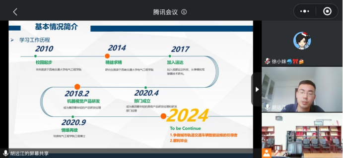 最后,优秀毕业生/在校生代表胡远江学长分享了学习和工作经验。胡学长在成都运达科技有限股份公司任职,本硕均毕业于awc777万象城娱乐官网,目前工程博士在读。胡学长从自己的切实感受出发,讲述自己当年面临选择继续深造还是工作的经历,鼓励同学们“一口气把书读到底”,这对于未来的工作也大有裨益。