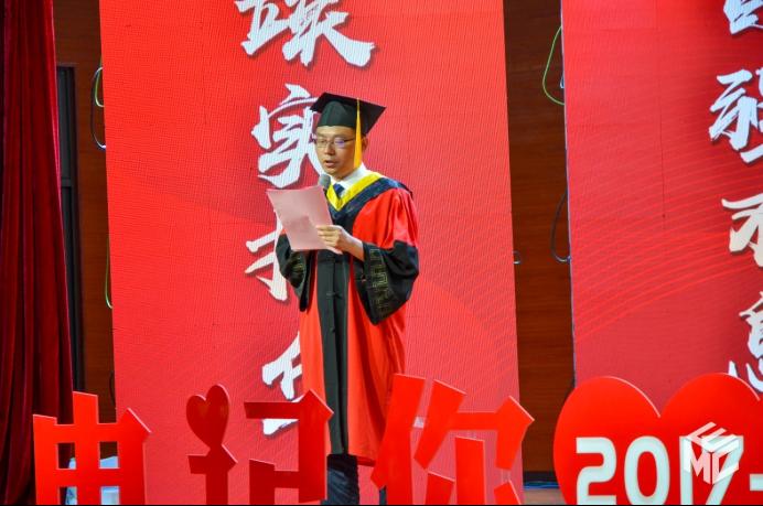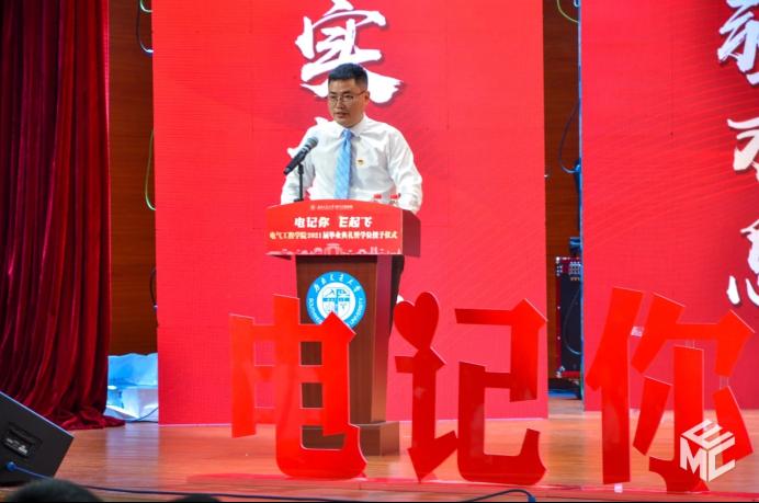 2017级电气9班导师宋文胜老师代表学院全体教师向毕业生送上临别赠言。宋文胜以“做好一个平凡人,活出不平凡的意义”为主题,向同学们讲述了自己的经历。他坦言在场的各位都是平凡的普通人,但是我们也应该活出生命的意义。我们应当感恩我们所遇到的困难与挫折,只有经历过苦难的人生才是有意义、有价值的。在发言的最后,他寄语同学,要培养自己的利他之心,要做一个对社会有价值的人。