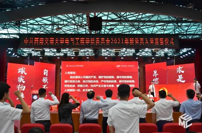 典礼的第一项议程是2021年新党员的入党宣誓仪式。毕业正逢建党百年,红旗下的青春更显风采。在众多老师同学的见证下,由院党委书记罗乾超同志领誓、院长陈维荣同志监誓,毕业生中的新老党员们在党旗前庄严宣誓,要矢志报国,以优异的成绩回报党和人民的抚育之恩,坚决为社会主义事业服务终身。新党员代表闫姝璇同志从百年前的嘉兴南湖红船为出发点,回顾了这百年间学院所作出的伟大奉献。谈起自己入党的心路历程,她表示“入党宣誓是一名共产党员政治生命开始的象征”,“我们都将永远记住这个神圣的时刻,永远记住自己向党和人民许下的承诺”。