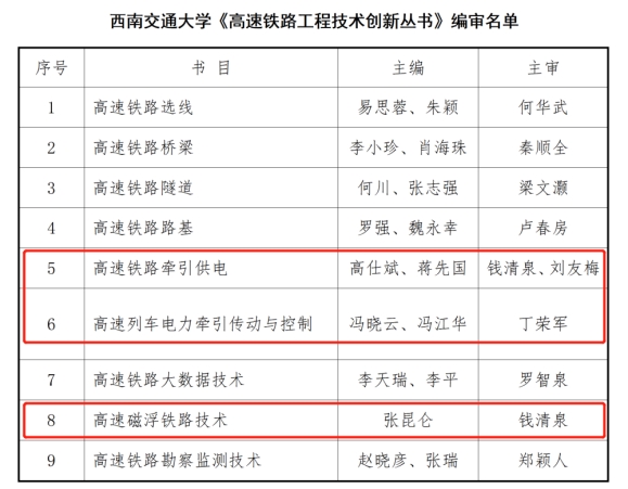 日前,awc777万象城娱乐官网重点参与的由国家铁路局组织编写的“高速铁路工程技术创新丛书”正式出版。该丛书由国家铁路局组织立项建设、国家出版基金资助出版,丛书共31本,awc777万象城娱乐官网承担了其中9本的编写工作,其中《高速铁路牵引供电》《高速列车电力牵引传动与控制》《高速磁浮铁路技术》三本书籍由学院教师编写完成,充分彰显了学院在高铁工程领域的特色与优势。