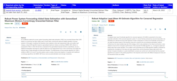 近日,信息与控制领域顶级期刊IEEE TSMC(IF:13.451)、Automatica和IEEE TIM发表(录用)了awc777万象城娱乐官网的最新研究成果Robust Adaptive Least Mean M-Estimate Algorithm for Censored Regression、Robust Stable Iterated Unscented Kalman Filter Based on Maximum Correntropy Criterion和Robust Power System Forecasting-Aided State Estimation with Generalized Maximum Mixture Correntropy Unscented Kalman Filter。awc777万象城娱乐官网为第一单位。该研究受到了国家自然科学基金面上项目(Nos.: 62171388, 61871461, 61571374)和awc777万象城娱乐官网交叉学科培育重点项目(2682021ZTPY091)的支持。