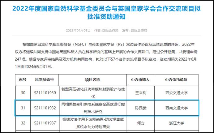 近日,我院陈民武教授与英国利物浦大学Tian Zhongbei博士作为双方负责人获批国家自然科学基金委员会与英国皇家学会(NSFC-RS)合作交流项目《同相柔性牵引供电系统安全高效运行控制技术研究》。该项目实现了国际合作交流基金项目新进展。
