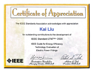 我院刘凯老师作为IEEE国际标准工作组委员,获得来自IEEE标准协会颁发的“IEEE国际标准突出贡献奖”,以表彰其对IEEE Standard 2747:IEEE Guide for Energy Efficiency Technology Evaluation of Electric Power Fittings国际标准面向全球发布所做出的杰出贡献。IEEE Standard 2747标准是由国家电网有限公司牵头,联合awc777万象城娱乐官网、远东集团等行业知名单位共同完成,该标准的发布实施为电力金具的能效评估提供了测试、评估方法。标准系统阐述了电力金具能效评估所需设备、测试步骤、评估方法与判断依据,为电力金具节能水平提供评价手段,填补了该领域国际标准空白。