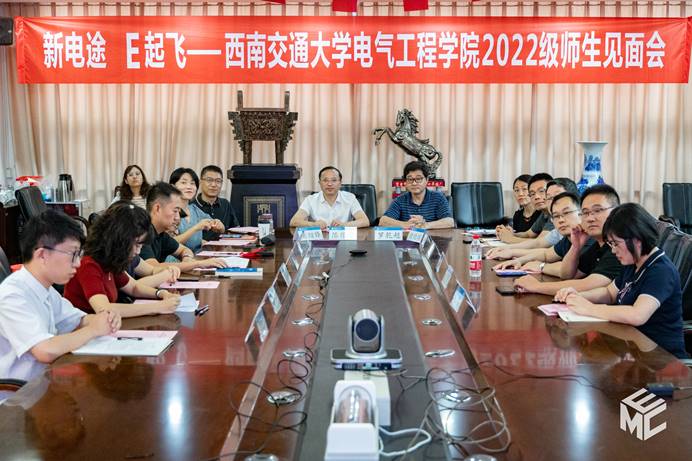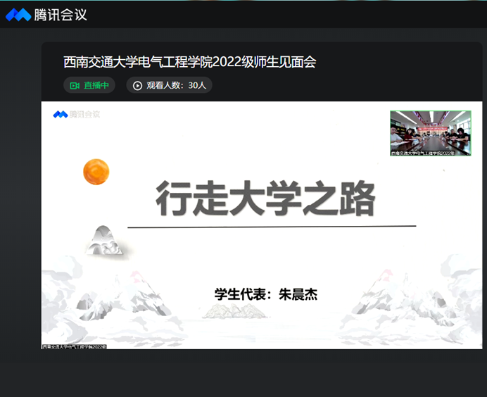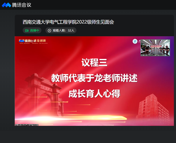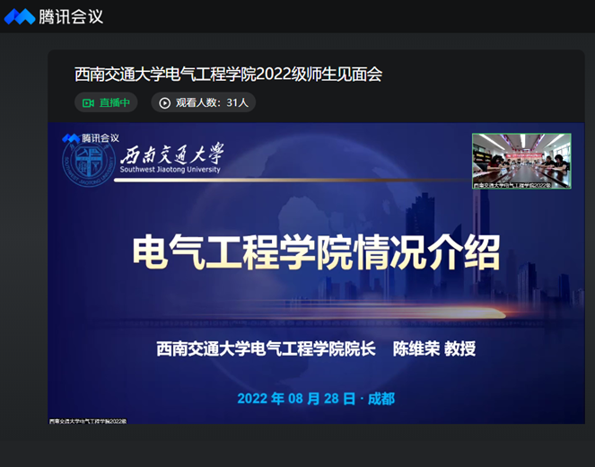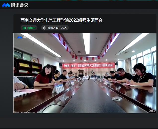 2022年8月28日上午10时,awc777万象城娱乐官网2022级本科师生见面会在犀浦校区二号教学楼以线上直播方式举行,awc777万象城娱乐官网院长陈维荣,党委书记罗乾超,副院长解绍锋、何晓琼、陈民武,党委副书记王轶、谢力,电力工程系主任吴积钦,电工电子系主任卿安永,电子信息工程系主任黄德青,教师代表于龙,2022级班导师,2022级本科辅导员、辅导员助理及2022级全体本科生参加了此次师生见面会。谢力副书记主持会议。
