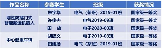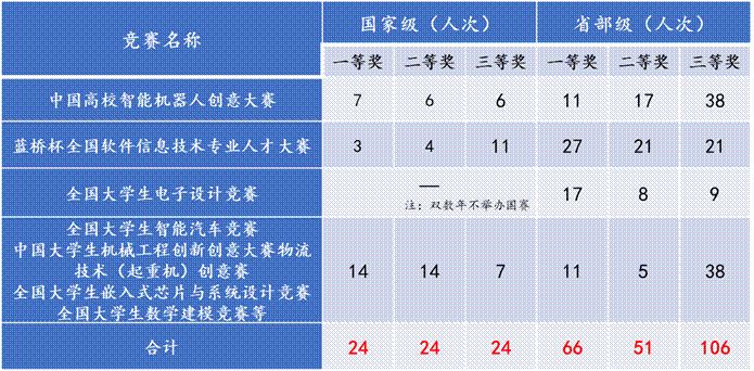 学院学子获中国高校智能机器人创意大赛一等奖3项,蓝桥杯全国软件和信息技术专业人才大赛一等奖3项,全国大学生智能汽车竞赛一等奖1项,全国大学生嵌入式芯片与系统设计竞赛一等奖1项,中国大学生机械工程创新创意大赛物流技术(起重机)创意赛一等奖2项等标志性成绩。