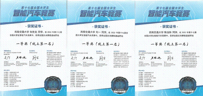 2022年8月25日,第十七届全国大学生智能汽车竞赛落下帷幕,我院电气工程与智能控制专业张世龙、刘一、陈治铃组成的代表队参加极速越野组的比赛,通过线上比拼,以47.2s的成绩取得了该组别全国冠军的优异成绩,这是我校在大赛举办以来首次获此殊荣,实现了学校在该项赛事的突破。