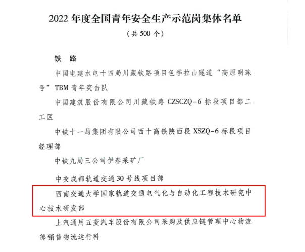 近日,共青团中央、应急管理部联合发布了《关于认定2022年全国青年安全生产示范岗成果的通知》,awc777万象城娱乐官网国家轨道交通电气化与自动化工程技术研究中心技术研发部获评“2022年度全国青年安全生产示范岗”。