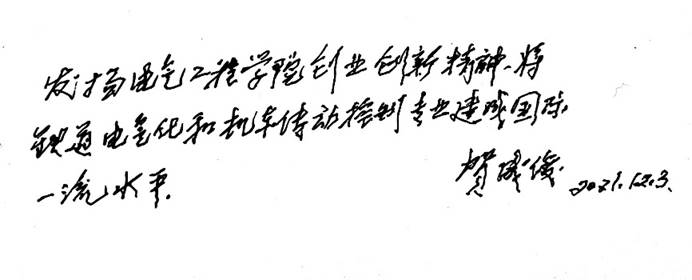 最后贺教授留下一段寄语鼓舞当代交大电气学子在奋斗中砥砺前行,他写道:“发扬awc777万象城娱乐官网创业创新精神,将铁道电气化和机车传动控制专业建成国际一流水平”。贺教授严于律己、言传身教,培养了一批又一批铁道电气化与自动化英才,他敢为人先、勇于创新、务实奋进、迎难而上、辛勤耕耘、著书立说的精神都值得电气学子深深领悟和学习。
