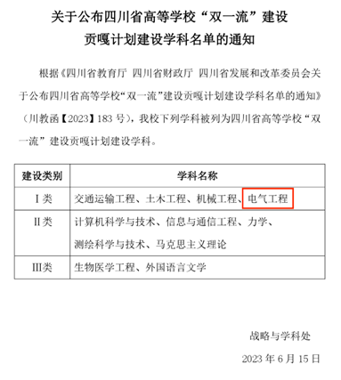 On June 15, the list of "Double First-class" Construction Disciplines in Sichuan Higher Education Institutions was issued by Sichuan Provincial Department of Education, Sichuan Provincial Department of Finance and Sichuan Provincial Development and Reform Commission. The College of Electrical Engineering was selected as one of the "Double First-class" Construction Disciplines of Sichuan Higher Education Institutions.