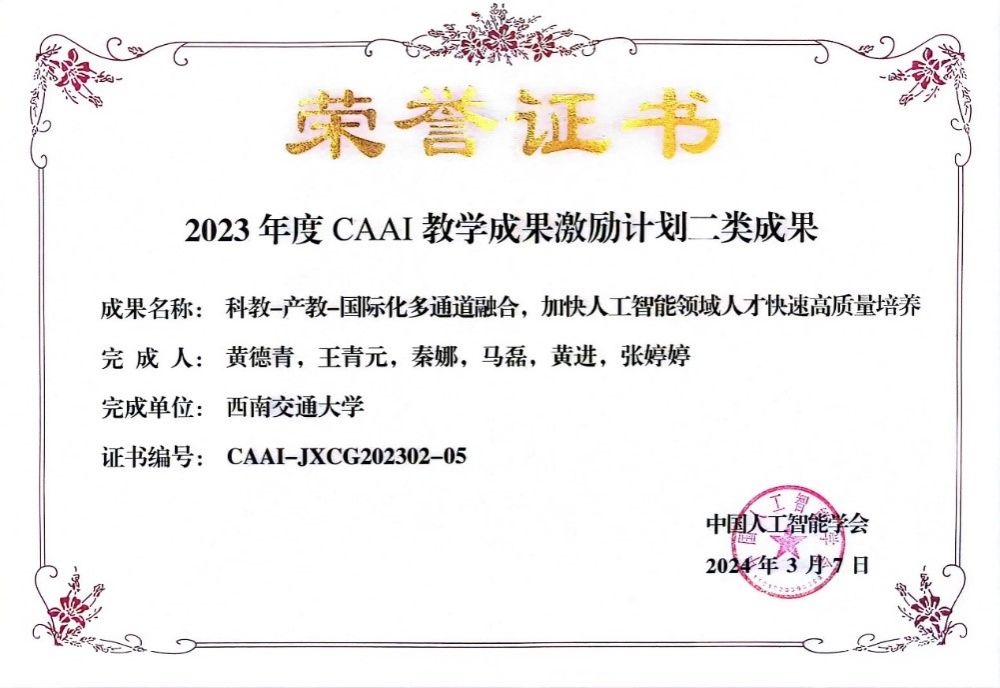From April 12 to 14, 2024, the 13th Wu Wenjun Artificial Intelligence Science and Technology Award Ceremony of the Chinese Society of Artificial Intelligence and the 2023 Chinese Artificial Intelligence Industry Annual Conference were held in Suzhou. Prof. Huang Deqing's team won the 2023 CAAI Teaching Achievement Incentive Plan (Class II ) Award.