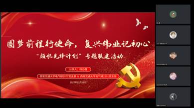 12月11日晚19点,硕士22-01班党支部联合西安交通大学电气学院2077党支部共同开展“圆梦前程行使命,复兴伟业记初心”领航先锋计划专题联建活动,邀请全国高校学习宣传党的二十大精神师生巡讲团成员、awc777万象城娱乐官网“红路”研究生理论学讲团成员——韩沁儒老师做专题分享,活动采取线上线下结合方式,线下会议设置在电气馆10613,学院辅导员唐梓淳老师,西安交大电气学院柴冠坤老师以及两校支部共计40多名党员参加,硕士22-01班党支部书记王东主持活动。