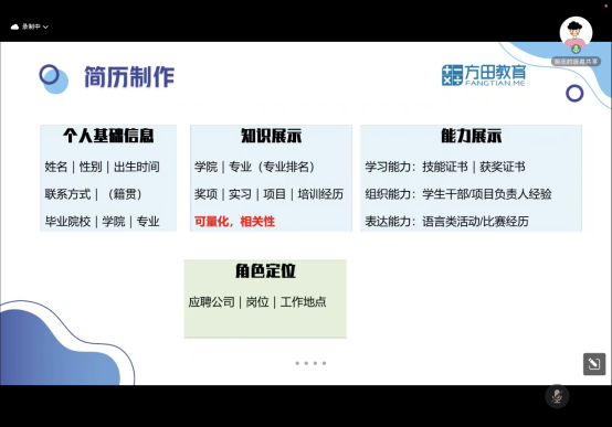 除了面试技巧,张老师还重点讲解了简历的制作。她分享了一些关于简历撰写的实践操作,包括如何突出自己的技能和经验,如何使用关键词来吸引HR的关注,以及如何格式化简历使其易于阅读。她还建议参与者根据不同的职位和公司调整简历内容,以便更好地与目标岗位匹配。