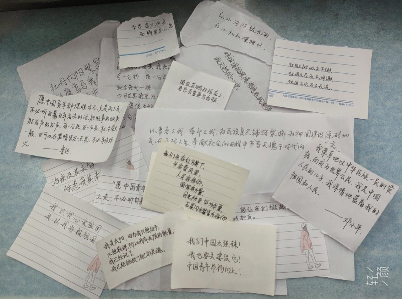 首先,团支部成员一起观看哔哩哔哩上近两百万播放的热门视频“这盛世如你所愿”,感受中国奇迹般的成长历史,感受无数仁人志士们的爱国主义。接下来,全体成员一起学习《错位时空》(五四特别版)歌曲,并进行了一次集体大合唱,在红色旋律中一同细品那段红色的岁月和一个个红色的传奇,全体青年都在合唱中感受到了无尽的力量在心中喷涌,为祖国做贡献的理想深深地刻在同学们的心中。不仅如此,团支书还组织同学们写下自己最想对祖国说的话,有的同学承诺:“以青春之我,奋斗之我,为民族复兴铺路架桥,为祖国建设添砖加瓦,在开拓人生,奉献社会的进程中书写无愧与时代的壮丽篇章。”又有的同学为祖国献上了自己的祝福:“祖国之树屹立不倒,祖国之花永不凋谢,祖国之水万古长流!”在团支书的呼吁下,部分同学还录下了自己对祖国的青春告白视频。在活动的最后,电气10班团支部全体青年迈着自信的步伐一同前往学校的竢实扬华碑前合影留恋,他们用灿烂的微笑,发出共同的心声——祝伟大祖国更加繁荣,富强!