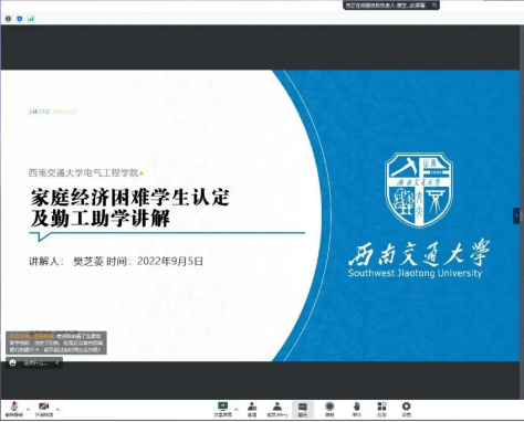 2022年9月5日19时整,电气学院本科2022级召开新生入学教育讲座,本次讲座以线上会议的形式进行,主题为学生资助专题,主讲人为学院资助负责人樊芝菱老师,学校“小资小助宣讲团”成员木荣俊、刘小菲、胡松。辅导员孙海洋及2022级新生参加了本次讲座。