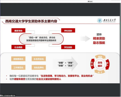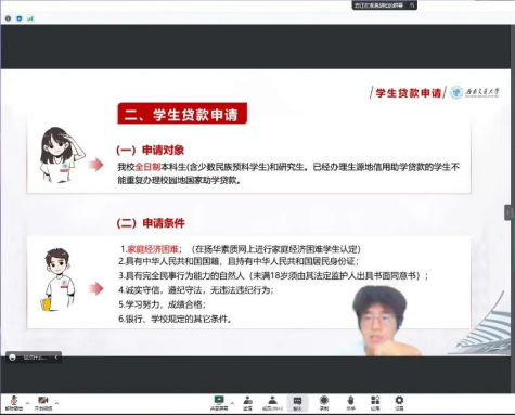 樊芝菱老师对家庭经济困难学生认定流程进行了讲解。樊老师就认定时间、对象、条件、所需材料和不得参加认定的情形进行了说明,并提醒同学们注意时间,避免错过申请。认定的流程包括系统认定及线下评议两部分,线上由学生提交后系统评定,线下将召开评议大会进行民主评议。家庭经济困难认定是部分奖助学金的首要条件之一,并再次提醒同学们应当随时关注相关时间节点,避免失去宝贵的机会。接下来是介绍勤工助学项目。樊老师向同学们介绍了报名要求、报酬、岗位设置、审批流程等,指出这是一种锻炼自我、提高个人能力的过程,并鼓励认定了家庭经济困难的同学积极参加,学院也开设了相关岗位供同学们选择。