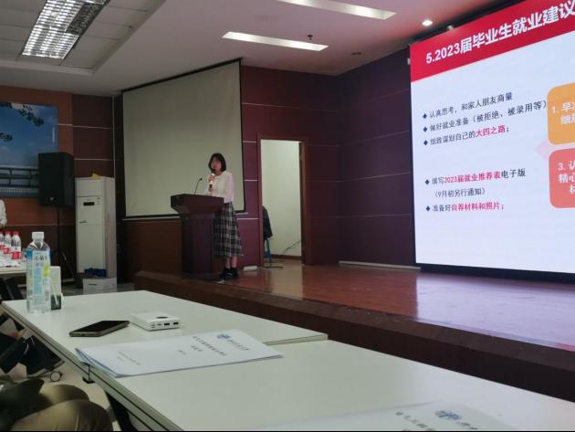 2023届辅导员樊芝菱向同学们介绍了学院毕业生的主要就业单位,同时给同学们展示了2023届毕业生前五学期的学分清查情况和四六级情况统计。她强调,完成培养体系的学分要求是毕业和就业的前提,部分同学要重视目前还未通过的课程。樊芝菱老师也为2023届毕业生们提供了就业建议。