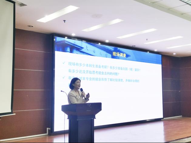 随后,学校招生就业处副处长黄春蓉老师向同学们从多个方面介绍了目前疫情下的就业形势。通过对比不同专业、不同时间、不同企业性质,她向同学们展示了如今的整体就业环境,并就如何了解自己、如何丰富自己、如何择业等问题提出了许多建议,帮助同学们结合自己的情况找到最满意的选择。