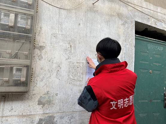 1月13日继续张贴前日未张贴完的通知,并向各小区志愿岗位送去防疫物资,加大宣传力度。
