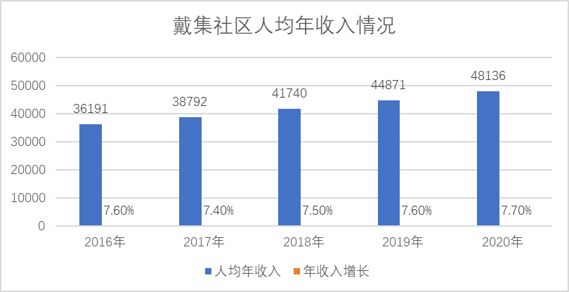 经过了解,戴集社区人均年收入水平已达约48136元(2020年数据),较之去年44871元增加3445元,增长7.7%,较之去年增长0.1个百分点,总体呈平稳增长态势。戴集社区积极落实国家制定的各项惠民政策,加大改革力度,满足居民日益增长的经济需求,进一步落实失业、低保、医保、养老和住房等保障体系。