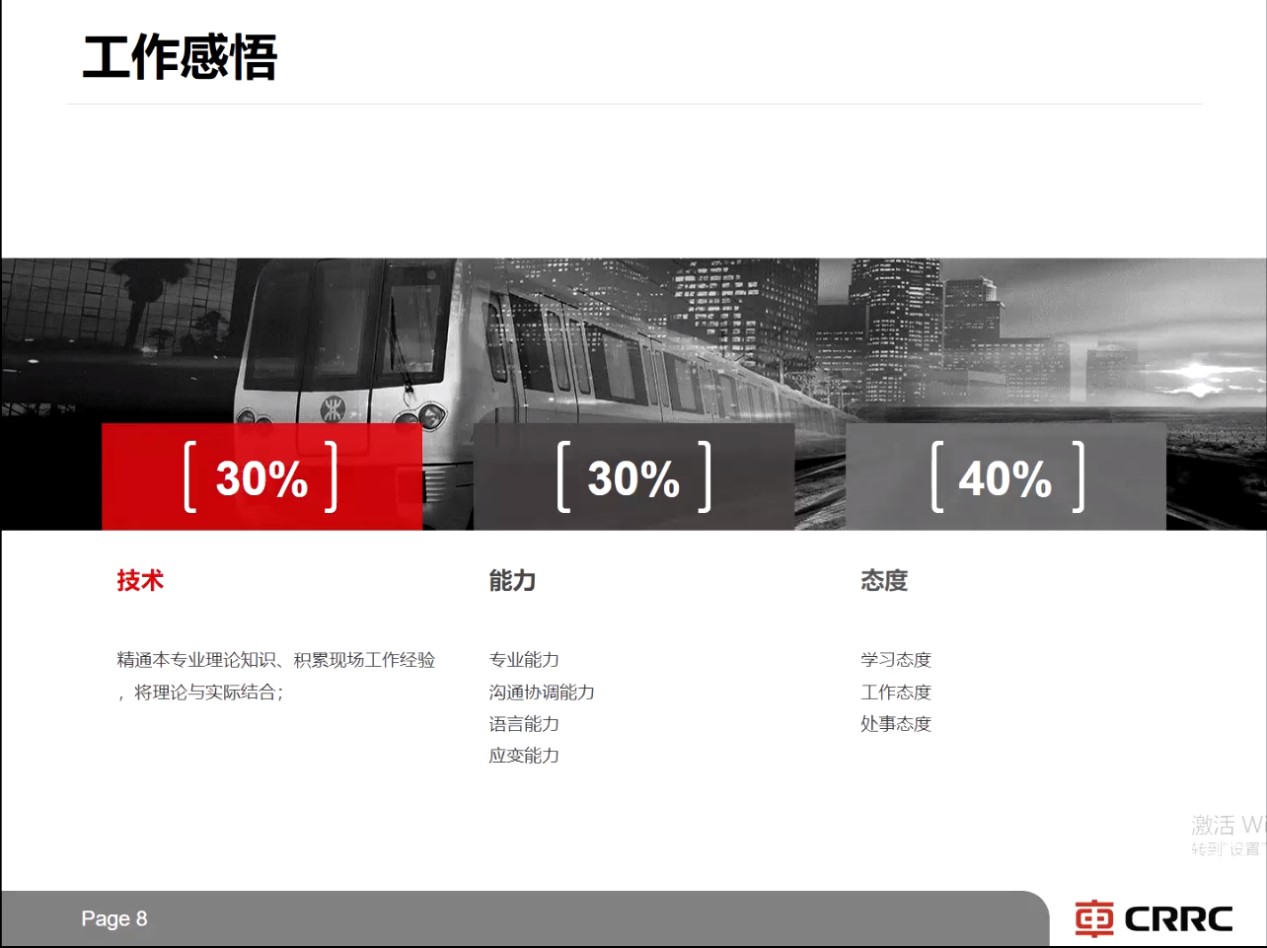 中车长春轨道客车股份有限公司工程技术中心工程技术部调试工艺师张铭哲学长首先进行工作感悟分享,从技术、能力、态度三个方面展开分享自己工作多年的心得体会。