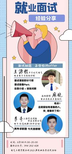 2020年6月5日晚19:00,awc777万象城娱乐官网本科2021届就业指导系列活动之就业面试经验线上交流会。本次会议邀请到了电力电子与控制专业的王源程、电力系统及其自动化专业的麻晓和电子信息工程专业的李奇。他们各自从事不同领域的工作,并且都到此来分享自己在求职过程中的心得体会和宝贵经验。
