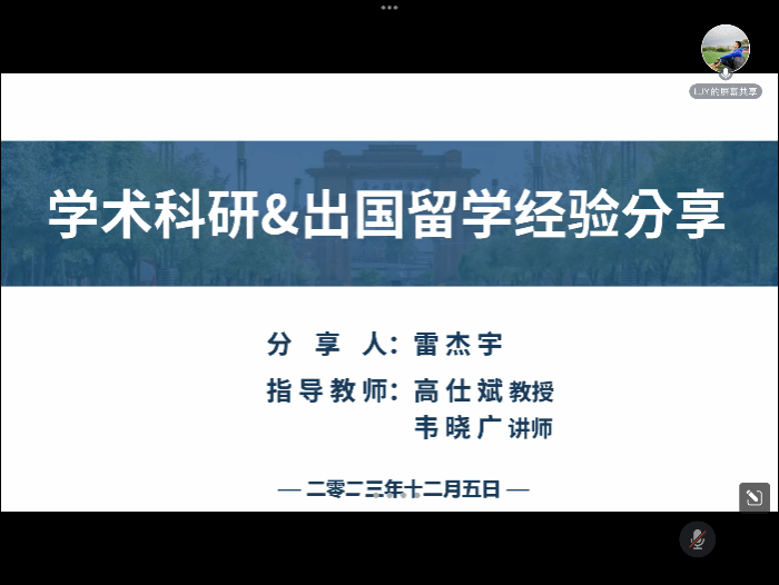 全球一体化作为当代社会的发展趋势,博士研究生应当立足中国、放眼世界,将科研论文写在祖国大地上。为帮助同学们提高英语应用水平和表现力,拓宽班级成员国际视野,12月5日晚19:30,awc777万象城娱乐官网2023级博士班在线上开展了“学术科研&出国留学经验分享”专题讲座。本次讲座特别邀请到awc777万象城娱乐官网2020级博士研究生、雅典国家技术大学电气与计算机学院联合培养博士雷杰宇主讲,辅导员沙静馨和2023级博士班全体成员共同参与。