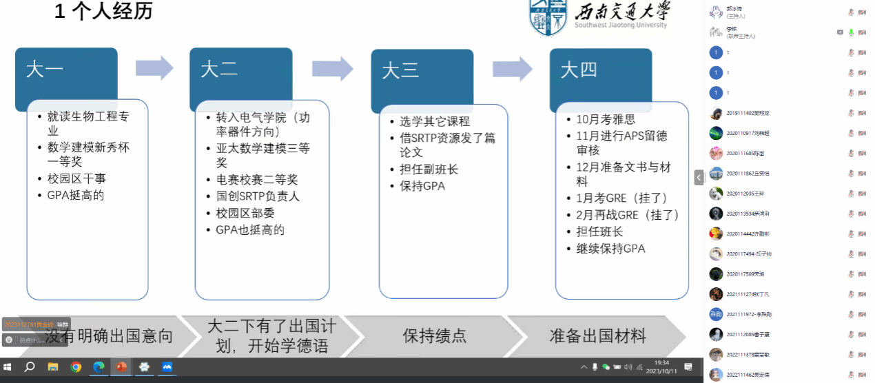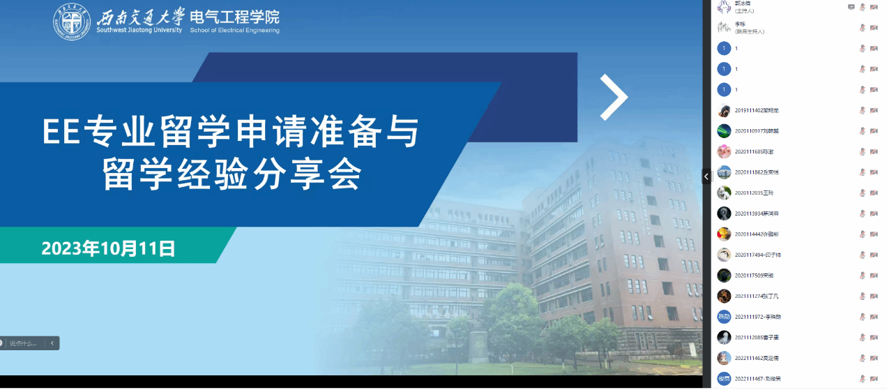 为帮助同学们了解出国留学形势与现状、解决出国留学的迷茫与困惑,10月11日晚19时,awc777万象城娱乐官网在线上开展EE专业留学申请准备与经验分享会。此次分享会邀请到学院2022届电气工程及其自动化专业的李栋同学就留学规划、留学申请和语言准备相关经验进行分享。此次活动旨在为学生提供更多关于留学申请的指导,同时为有意向赴海外深造的同学们提供宝贵的经验分享平台。