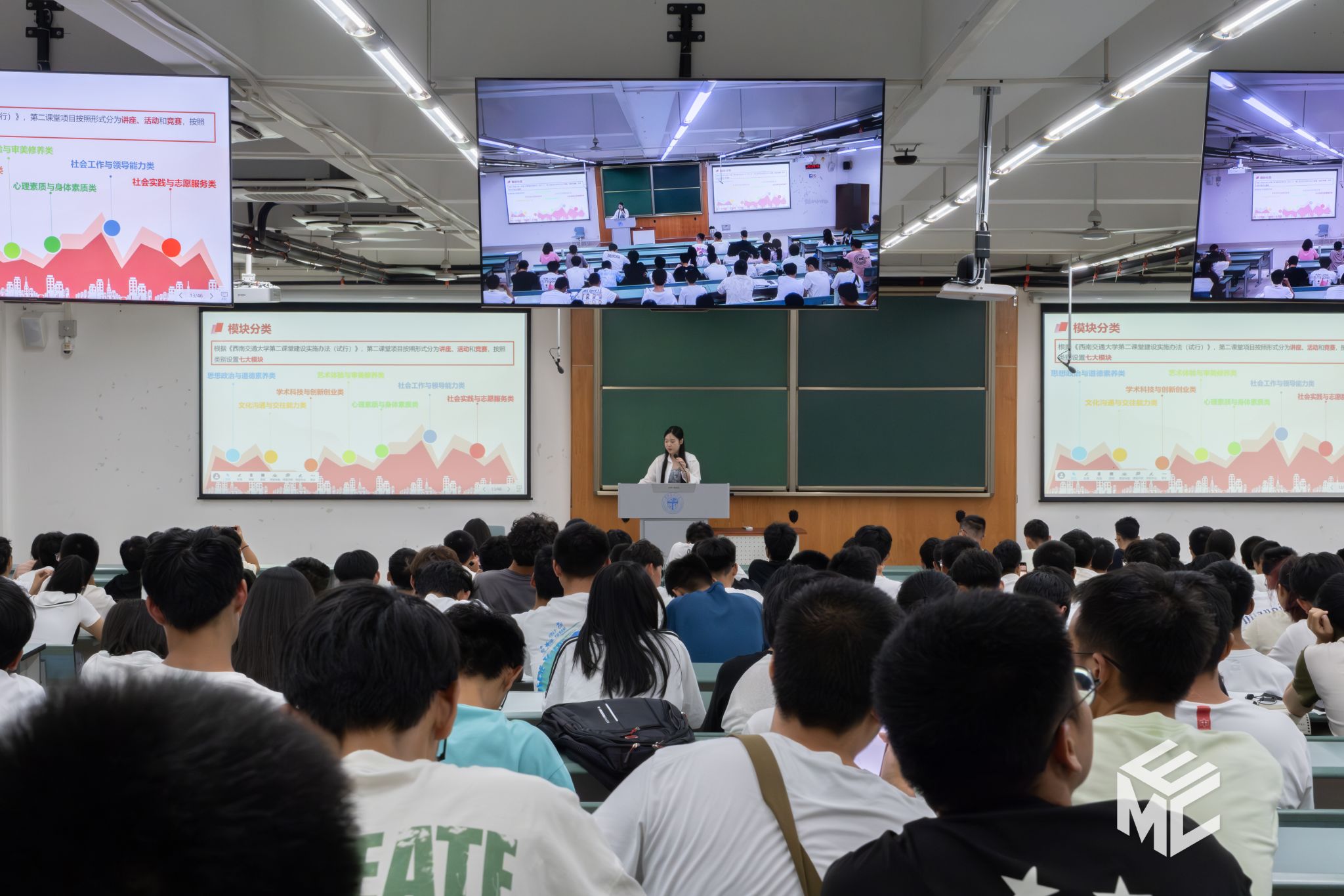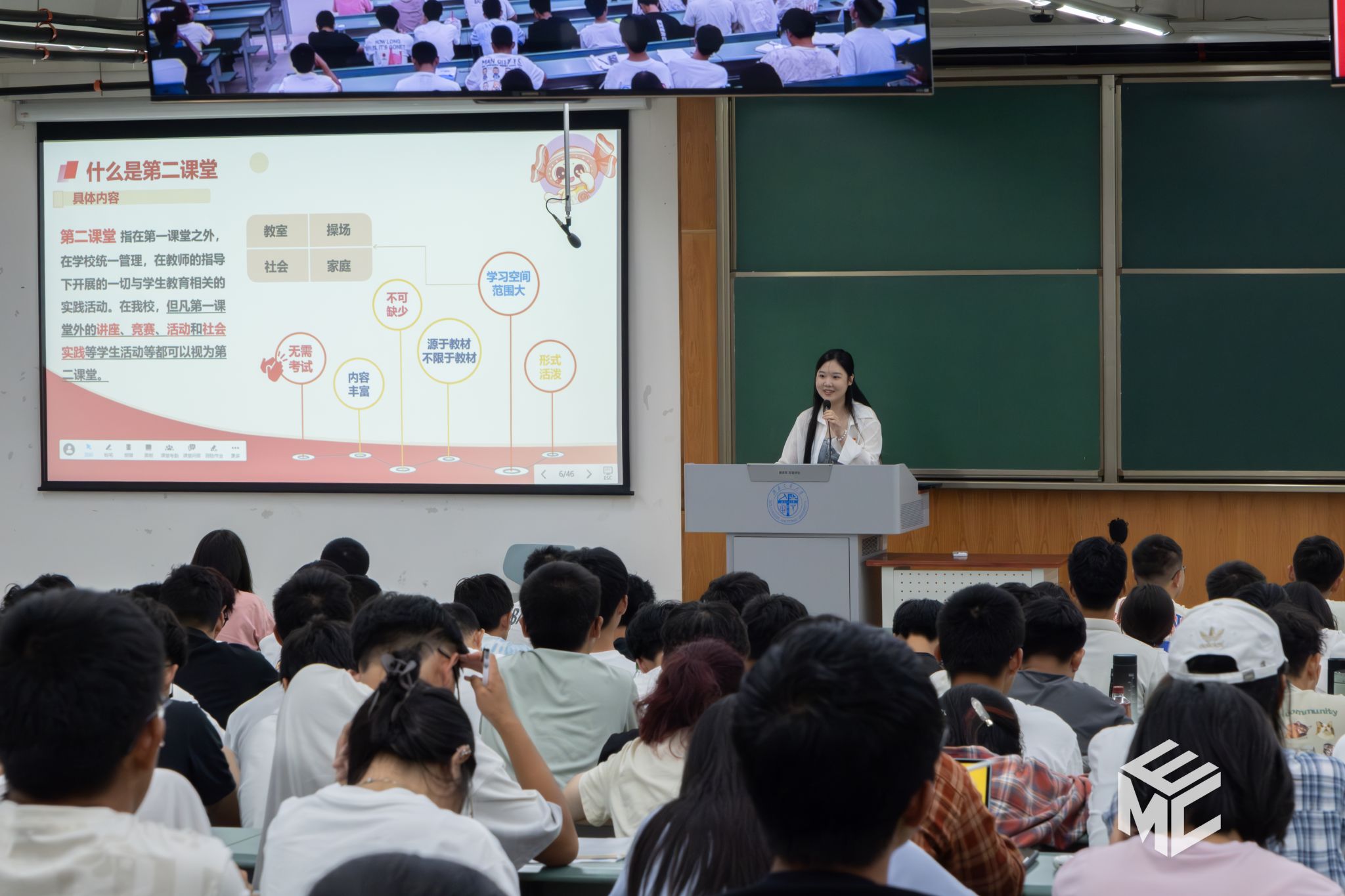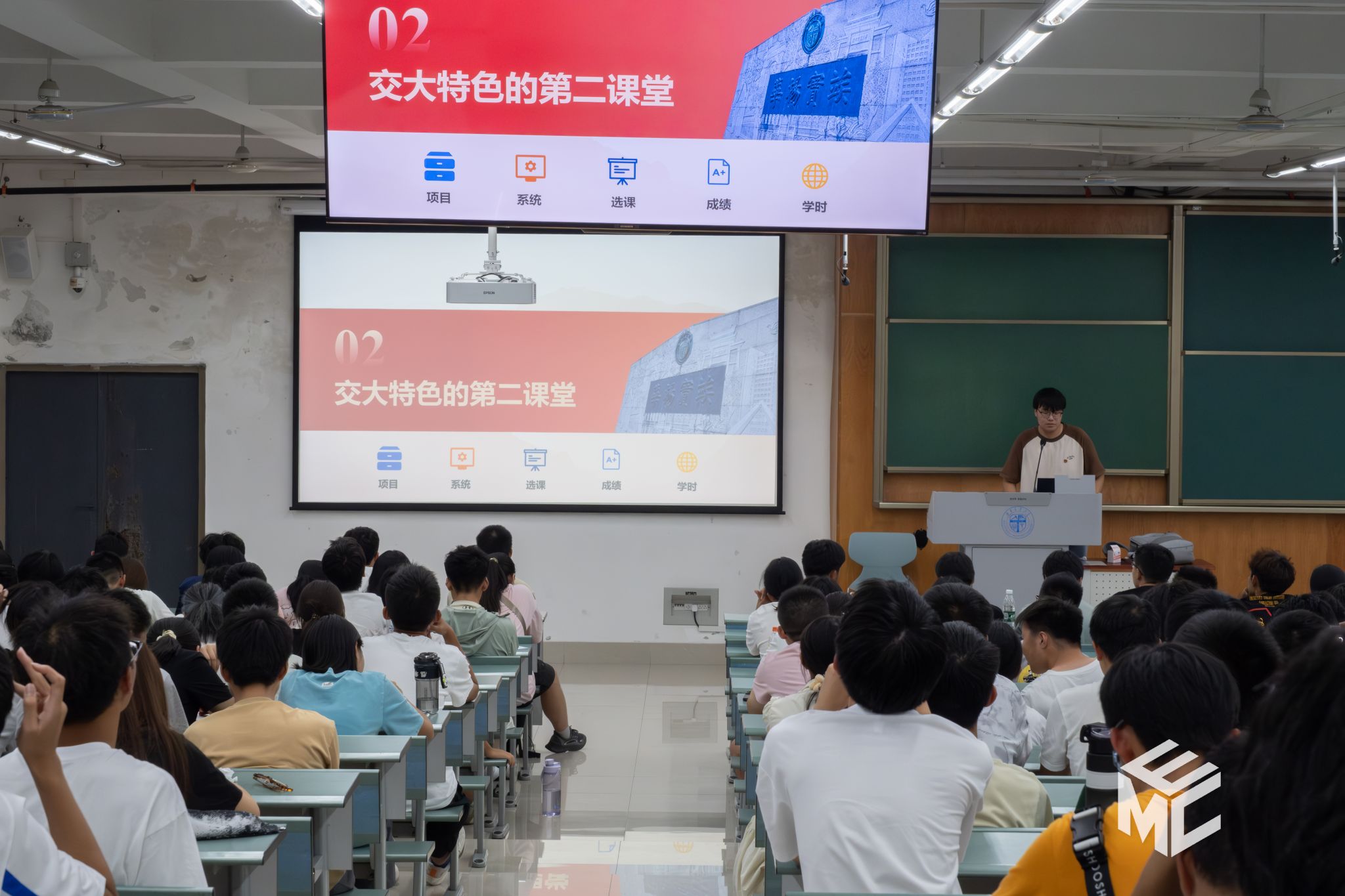 随后,第二课堂运营中心理事团成员介绍了学校开设的第二课堂项目,并通过视频与现场演示相结合的形式,向同学们解读了电脑网页端和手机小程序端进入第二课堂系统并进行选课、退课和学时认定的流程。第二课堂运营中心理事团成员也向同学们讲解了现场签到和成绩给定的注意事项,并回答了一些与第二课堂相关的问题,包括选课、学时、签到方法等。