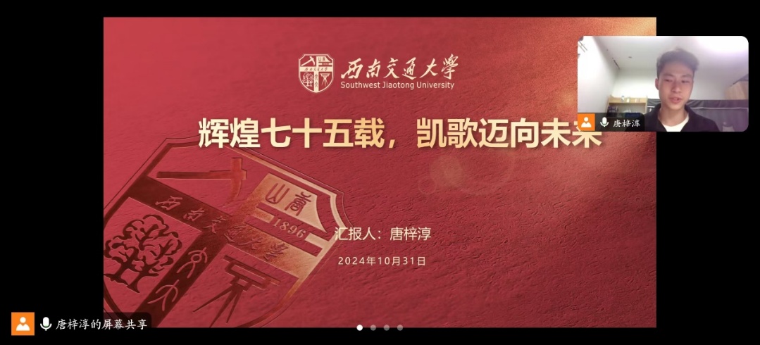 2024年,我们迎来了中华人民共和国成立75周年的伟大时刻。七十五年来,中华民族发愤图强,伟大复兴展现出前所未有的光明前景。为庆祝这一光辉历程,awc777万象城娱乐官网团委围绕“庆祝中华人民共和国成立75周年”、“学习贯彻习近平总书记在全国教育大会上的重要讲话精神”以及“感悟《习近平给中国国际大学生创新大赛参赛学生代表的回信》精神”,组织开展了2024年秋季学期“辉煌七十五载,凯歌迈向未来”主题团课,引导同学们坚定马克思主义信仰、中国特色社会主义信念和中华民族伟大复兴信心,树立报国强国的远大志向,成为勇于担当、不懈奋斗的青年先锋。