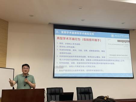 为打造“精勤研途”,传承“双严”传统,助力研究生2023级新生合理开展学业规划,学院恪守科学精神、坚守学术诚信系列教育活动于9月26日15:00在九里校区J0222开展研究生培养相关文件解读与学术规范要求讲座,副院长刘志刚教授主讲。