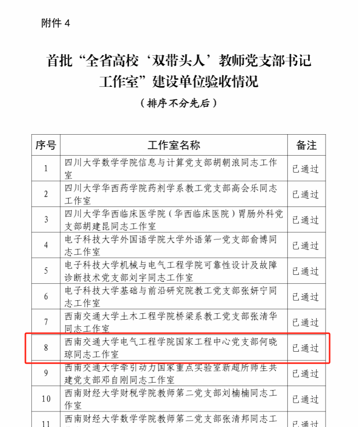 近日,四川省委教育工委公布了首批新时代四川高校党建示范创建和质量创优工作建设单位验收通过名单。学院党委、国家工程中心党支部、国家工程中心党支部书记“双带头人”工作室(何晓琼同志工作室)顺利通过验收。