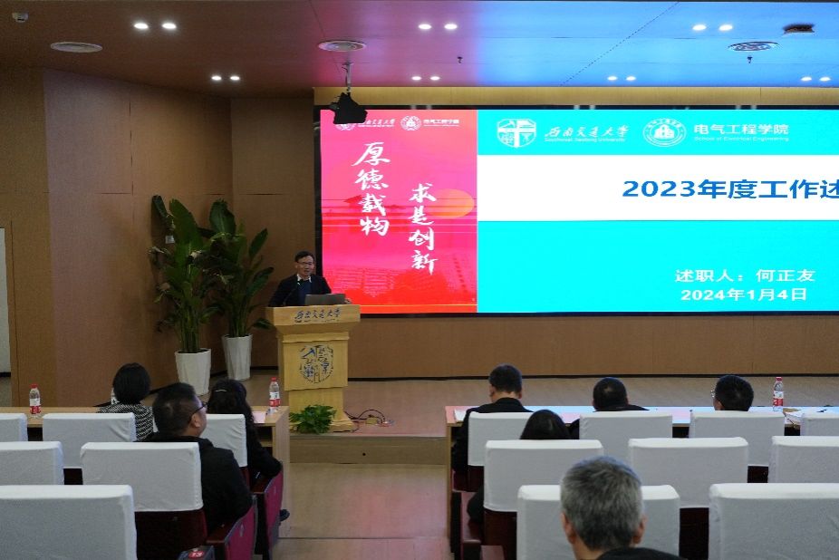 2024年1月4日下午,awc777万象城娱乐官网2023年党建及领导干部述职评测大会在犀浦校区图书馆一号报告厅顺利召开。正处级组织员兼纪检监察员谭建鑫老师、awc777万象城娱乐官网院长何正友、党委书记王斌、副书记谢力、副书记王轶、副院长何晓琼、解绍锋、陈民武、胡海涛、刘志刚、微电子产业学院副院长宋文胜,以及学院教职工和学生代表共同参加会议。本次述职测评大会由王斌书记主持。