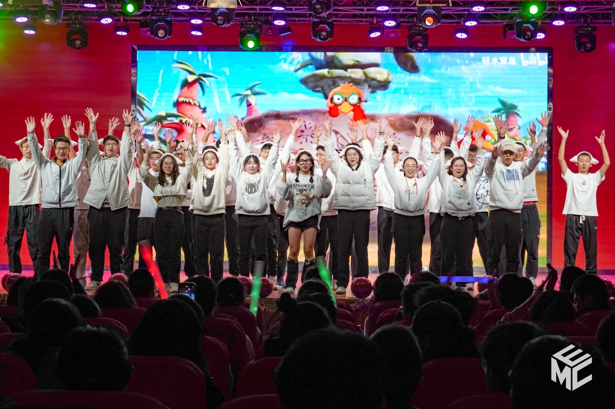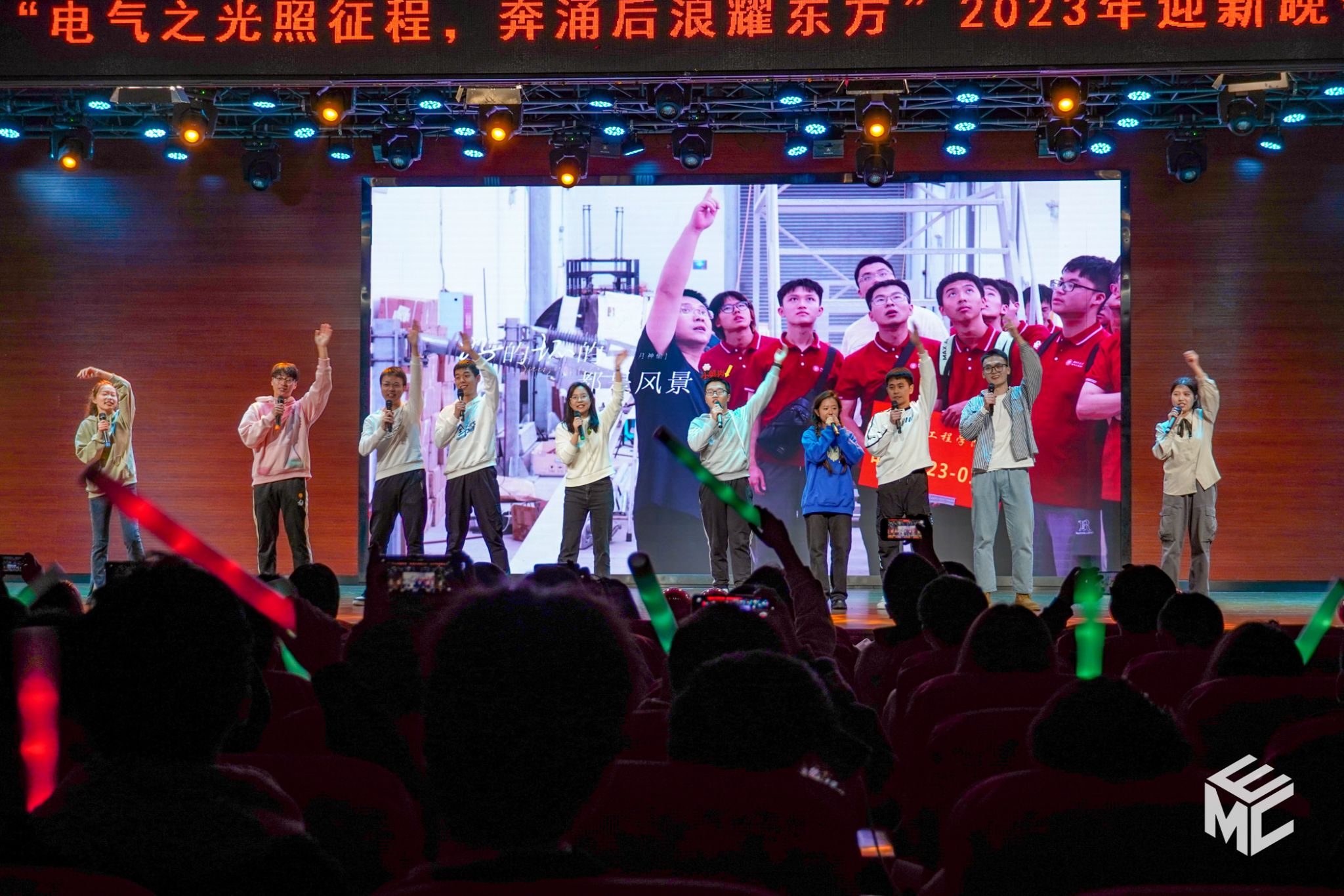 晚会下半场的主题为“以梦为马·不负韶华”,电气2023-04班的合唱《奔跑》为大家带来了随风奔跑、青春昂扬的旋律;其次是电子2023-04班的舞蹈《燃动青春》,展现了电气人的热情奔放;随后,电气2023-09班的情景剧《家庭电视台》回忆了家庭中温馨的点滴片刻;电子2023-01班、电气2023-08班、电气2023-09班和电气2023-11班共同合作的《歌曲串烧》,诠释了团结乐观的电气风貌;电子2023-02班的舞蹈《被子舞》和电气2023-05班的合唱舞蹈《明天你好》,展现了电气学子的创新思维;电气2023-07班的独唱《不遗憾》、电气2023-10班的舞台剧《达拉崩吧》和电子2023-01班的合唱《入海》,展现了各新生班级旺盛的青年活力。在晚会的最后,2023级辅导员老师詹睿、罗霁轩与九位辅导员助理为全场观众带来隐藏节目《爱你+岁月神偷》,回忆了迎新点滴,对新生大学四年的时光送上美好的祝愿。