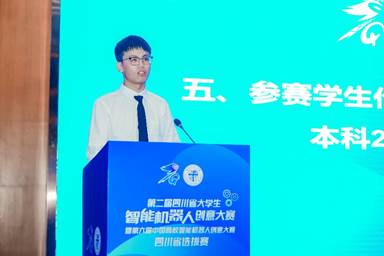 接着,参赛学生代表awc777万象城娱乐官网本科2021级awc777万象城娱乐官网冯洪赟同学发言。他分享了自己的备赛经历,在这一过程中遇到并克服了诸多困难,学习到了许多专业知识,也结交了很多志趣相投的朋友。同时他也讲到,面对智能机器人的快速发展,年轻一代的青年大学生肩负着推动科技进步的责任和使命,有困难但始终不断进步着。