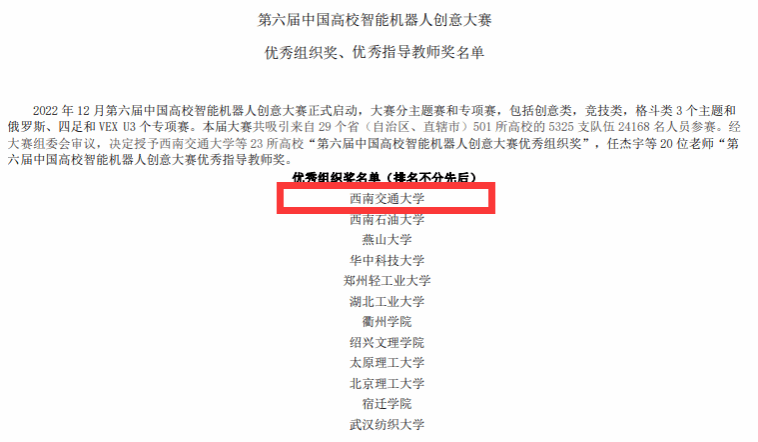 中国高校智能机器人创意大赛创办于2017年,首届大赛由中国高等教育学会、教育部工程图学课程教学指导委员会、中国高校智能机器人创意大赛组委会共同主办,浙江大学机器人研究院、中国高等教育学会工程教育专业委员会承办。大赛于2020年列入中国高等教育学会发布的全国普通高校大学生竞赛排行榜。四川省大学生智能机器人创意大赛由四川省教育厅主办,awc777万象城娱乐官网承办,awc777万象城娱乐官网协办,至今已连续举办两届,大赛自启动以来,受到省内各大高校师生的广泛关注和热烈响应。2023年,四川赛区以优异的办赛质量和高质量的国赛推选作品,荣获第六届中国高校智能机器人创意大赛优秀组织奖,学院王青元、潘育山老师荣获国赛优秀指导教师奖。