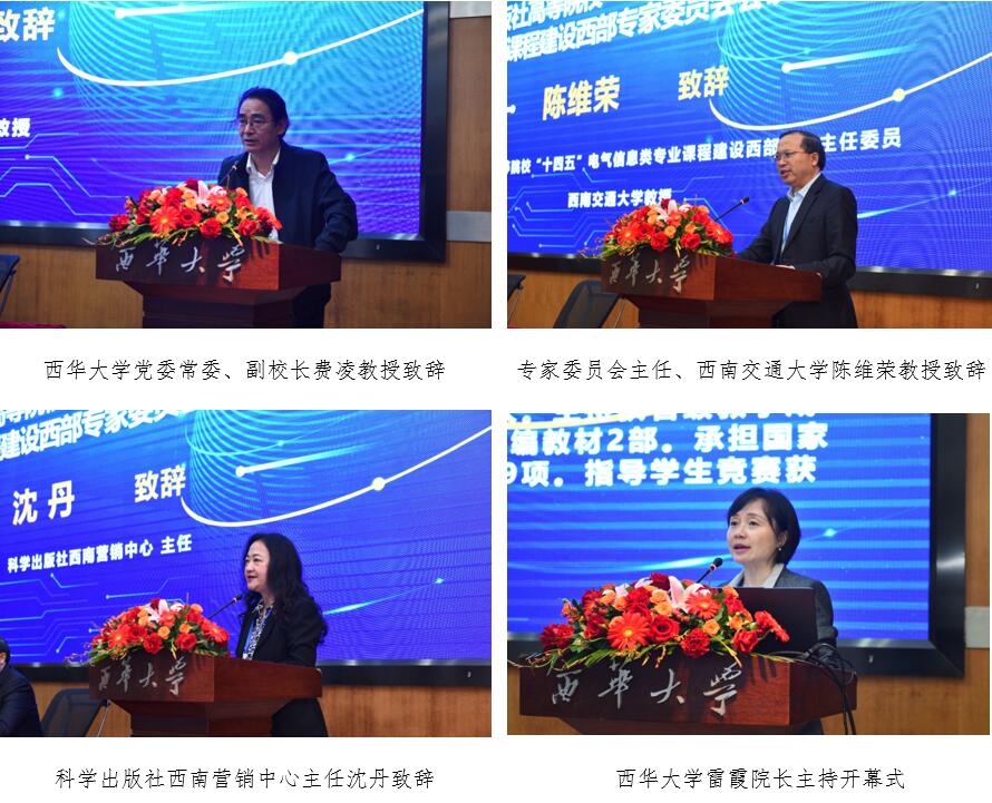 西华大学电气与电子信息学院院长雷霞主持大会开幕式及主题报告。西华大学副校长费凌在开幕式上致欢迎辞,他分享了电气与电子信息学院在此领域取得的丰硕成果,并指出在教材与课程建设中立德树人的重要性。专家委员会主任委员陈维荣教授充分肯定了专家委员会在过去工作中取得的显著成效,并展望未来将进一步加强课程思政建设,开辟数字化教育新领域,及推进高水平教材的建设。科学出版社西南营销中心沈丹主任向与会者介绍了专委会在推动教材建设方面所取得的成果。