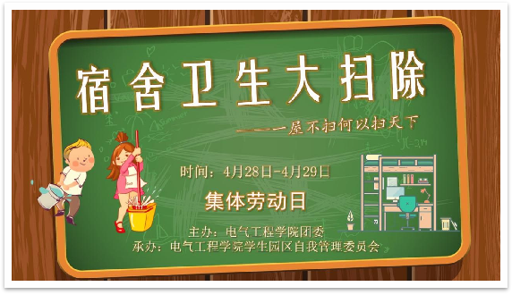 为全面落实中共中央国务院《关于全面加强新时代大中小学劳动教育的意见》,深入学习贯彻习近平总书记在全国教育大会上的讲话精神,同时迎接即将到来的“五一”国际劳动节,电气学院决定以“宿舍卫生大扫除”、“我眼中的劳动美”两项活动内容为依托,开展“集体劳动日”活动,引导学生积极参与到活动中来,以自己的切身感受体验劳动带来的乐趣,以劳动促进学生道德品质的提高,充分展示当代青少年学生朝气蓬勃、奋发进取的精神风貌。